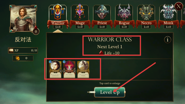 1、游戏中先关注职业系统,了解升级所需条件和升级奖励。通过消耗经验和其他资源,利用“Levelup”按钮提升职业等级,解锁新技能卡牌。