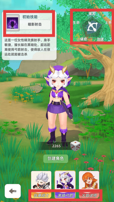 1、游戏开始,选择角色(如黑暗弓箭),了解其初始技能和属性(生命、上手、辅助、攻速)。根据角色特点,制定初期战斗策略。