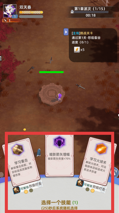 2、进入关卡(如第1章波次),留意关卡任务和剩余时间。面对技能选择,结合角色技能和战斗需求,选择合适技能提升战斗力。