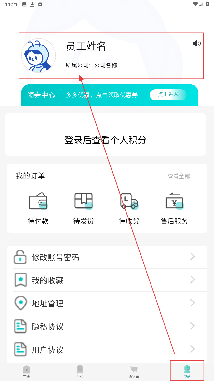 1、打开应用,在底部导航点击【我的】,进入个人页面,显示员工姓名、所属公司及订单、积分等功能,点击对应功能使用。
