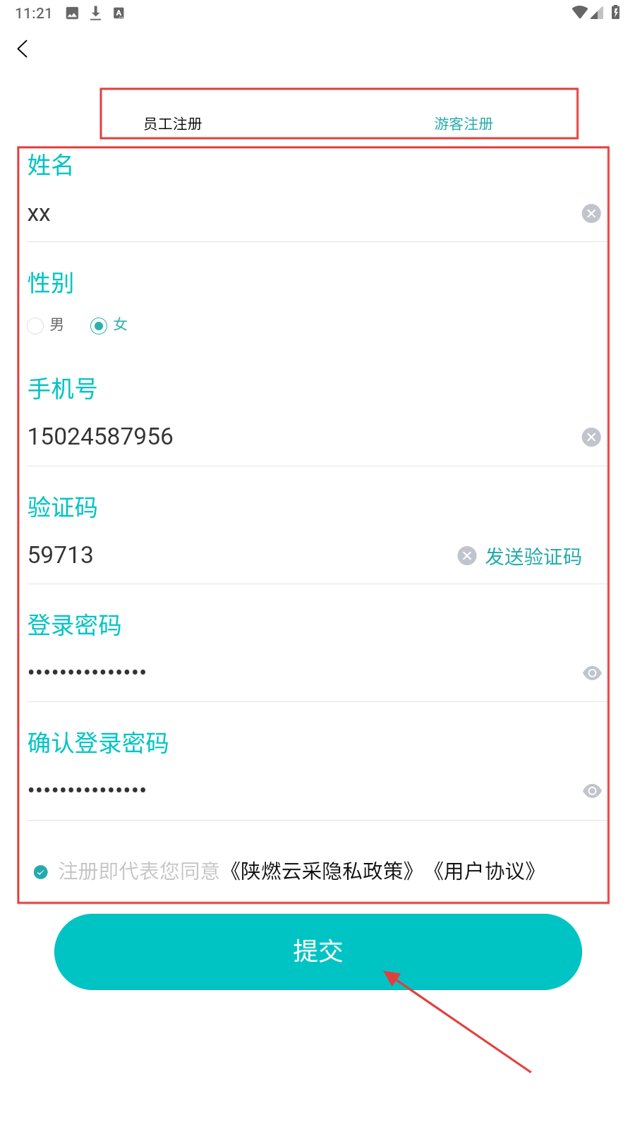 3、填完注册信息(姓名、手机号、验证码、密码等),勾选同意协议,点击【提交】完成注册,后续可登录使用应用功能。