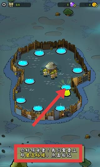 1、游戏开局,收到“立即建造塔楼”提示,点击标记位置建造塔楼,利用场地中的蓝色光点等资源,初步搭建防御体系。