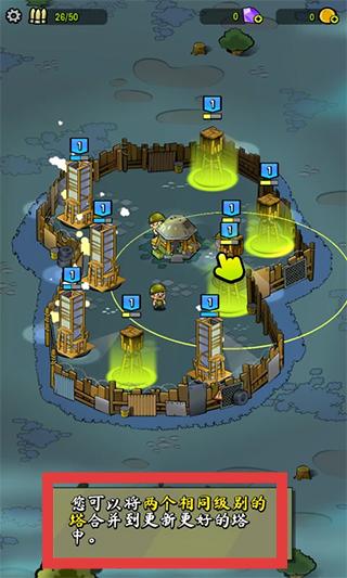2、游戏过程中,依据“将两个相同级别的塔合并到更新更好的塔中”规则,合并塔楼提升等级,增强防御能力。