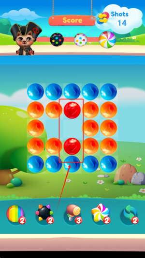 2、发射匹配泡泡:触屏控制发射方向,将泡泡射向对应颜色的泡泡群,三个及以上相同颜色即可触发消除。