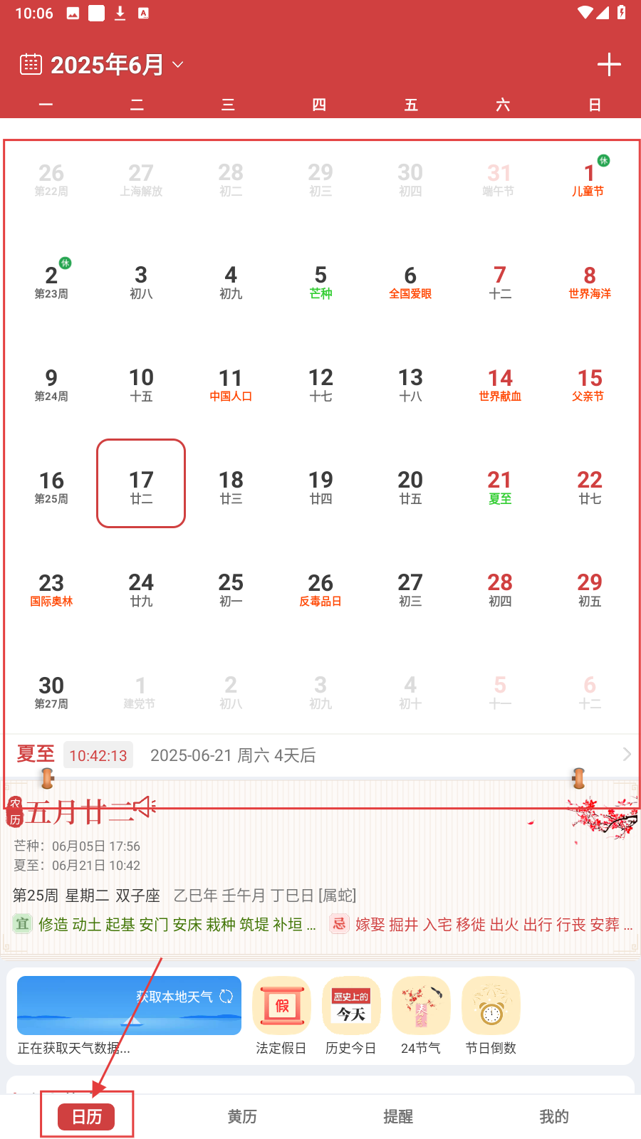 1、打开应用,在【日历】界面,可以进行查看日期,含节日、节气标注,如6月1日儿童节、6月5日芒种等。