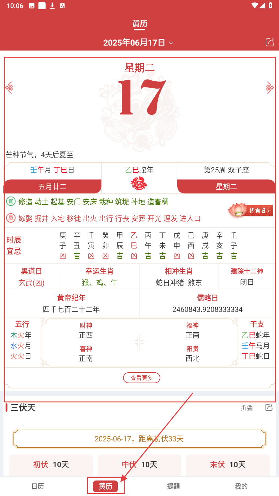 2、点击【黄历】,查看黄历信息,有干支、宜忌、时辰吉凶等内容,如当日为乙巳蛇年壬午月丁巳日,宜修造等、忌嫁娶等。