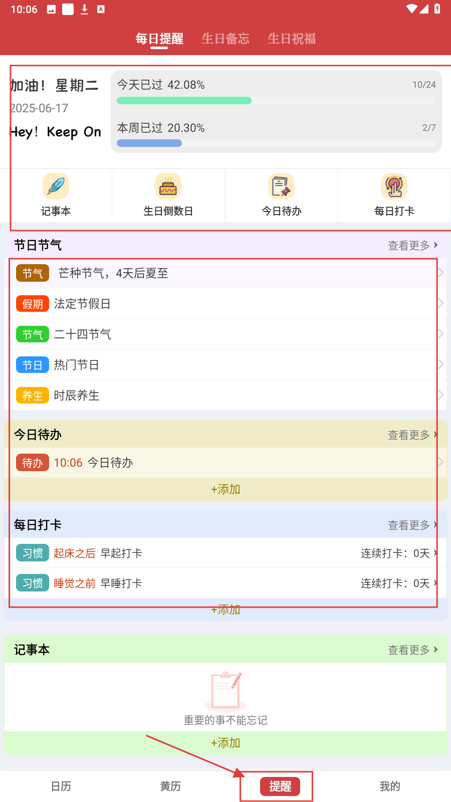 3、在【提醒】页面可设置每日提醒、生日备忘等,有节日节气、今日待办、每日打卡等分类,能添加记事、待办事项。