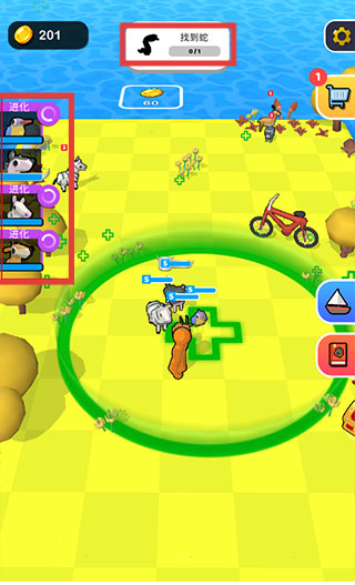 1、游戏开始,关注屏幕左侧的动物栏,这里显示可操控或可进化的动物。利用这些动物探索场景,完成任务(如找到蛇)。