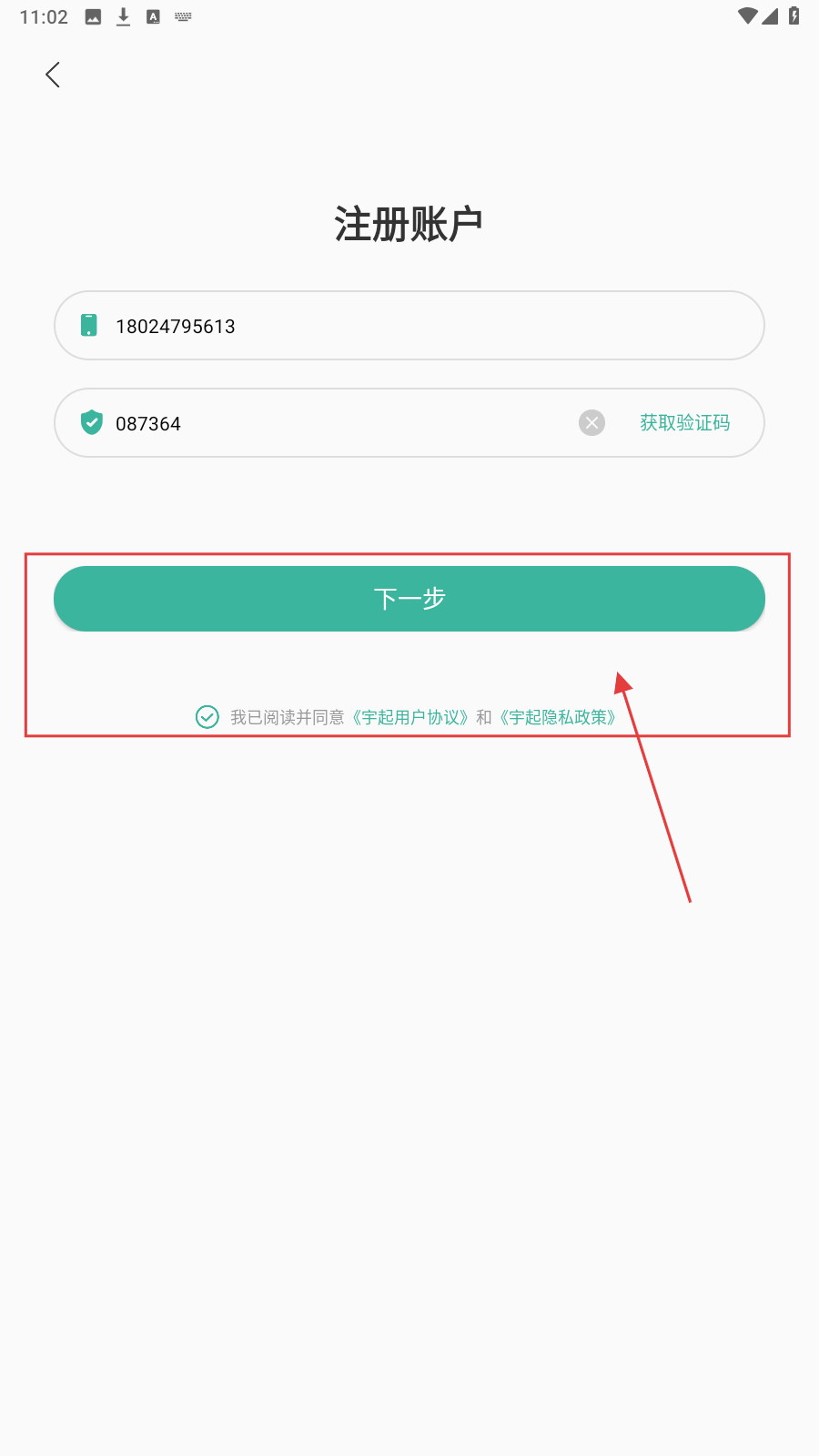 2、在【注册账户】页,填写手机号码,点击【获取验证码】,填入收到的验证码。