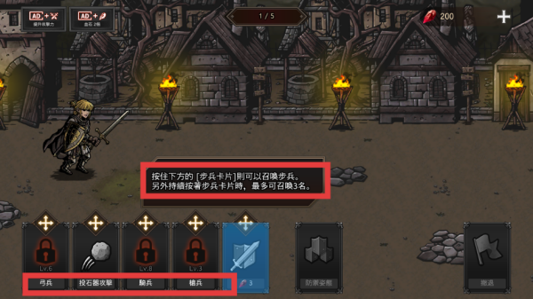 3、按照提示操作,按住下方的兵种卡片召唤步兵,最多可召唤3名。还可利用其他兵种和技能,合理安排兵力和策略,完成关卡任务。
