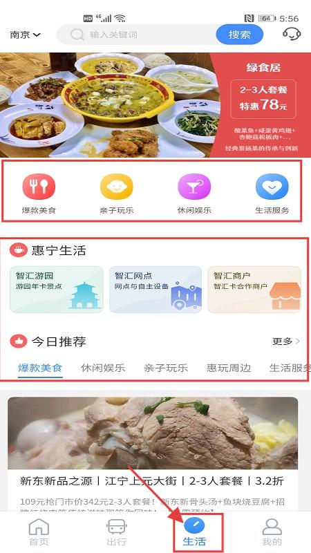 2、切换至【生活】页,有爆款美食、亲子玩乐等分类入口,浏览“惠宁生活”、今日推荐(餐饮优惠)内容,点击对应图标/信息可参与。