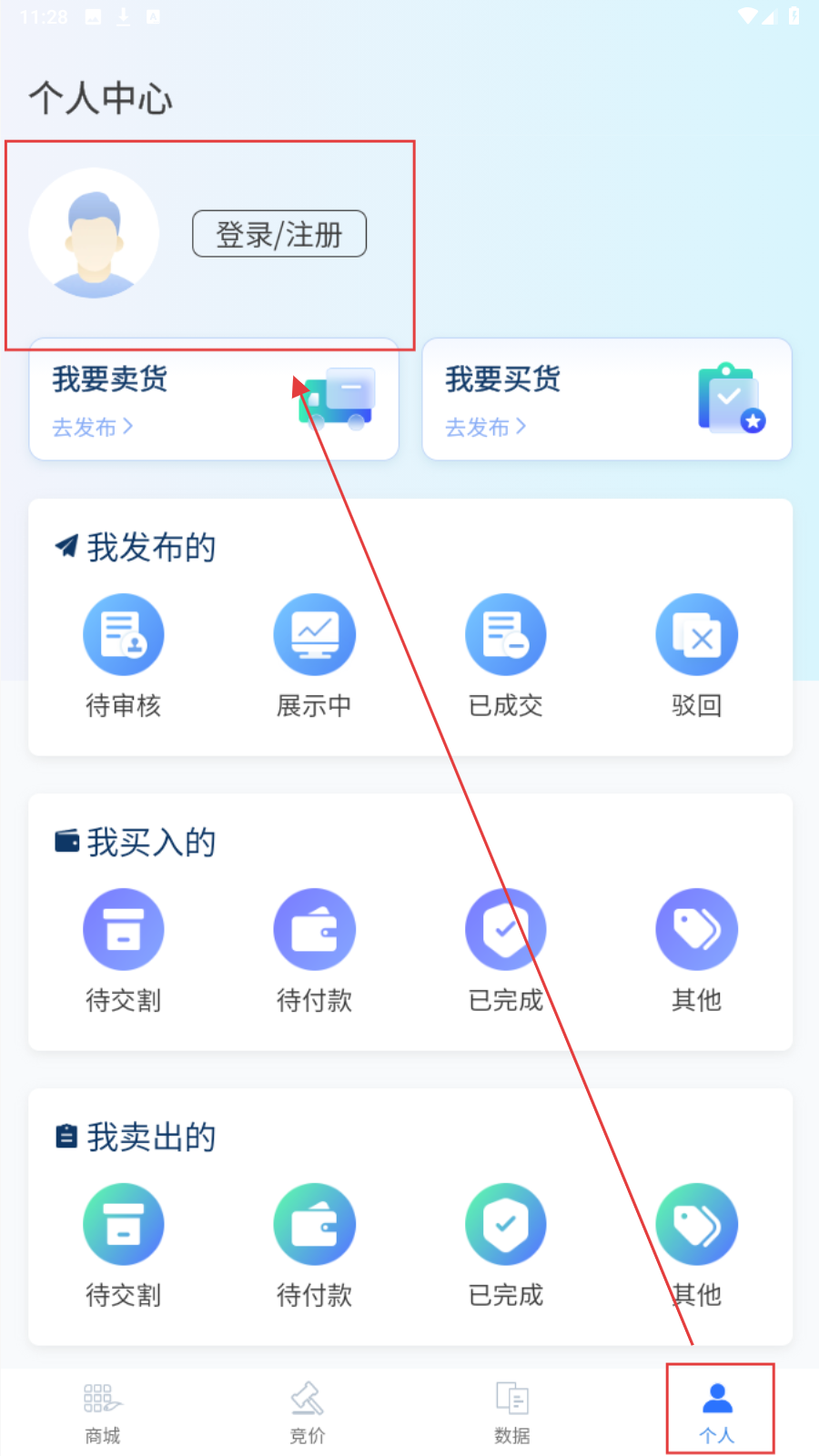 1、打开应用,进入【个人】页,点击【登录/注册】按钮,跳转至登录界面。