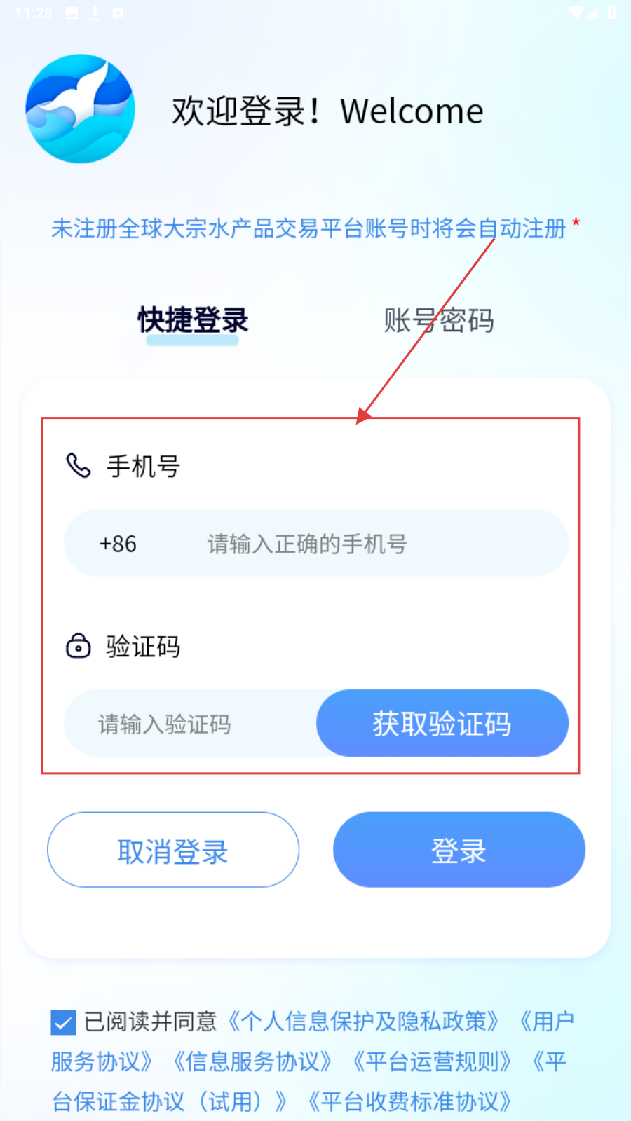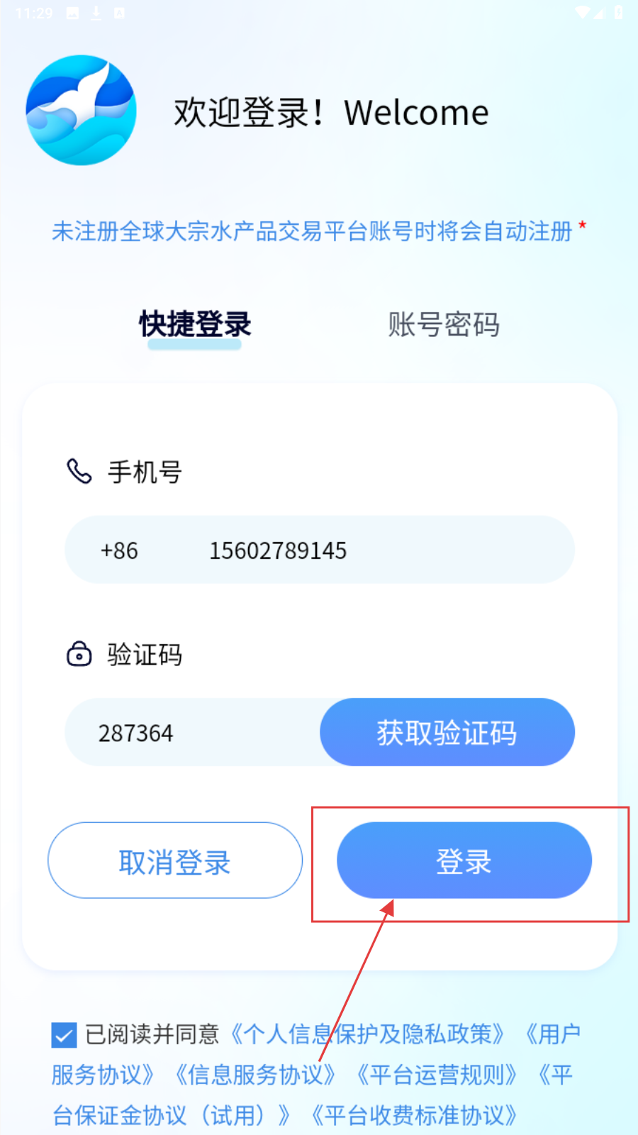 3、勾选同意协议,点击【登录】按钮,即可完成注册,可使用卖货、买货等交易功能。