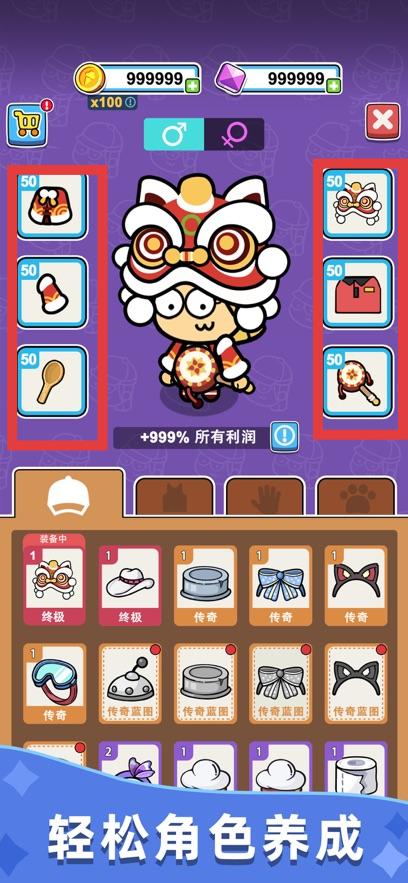 1、在角色养成界面,利用金币和钻石,为角色穿戴各类装备,每件装备显示数值50,穿戴可提升角色属性,获取“+999%所有利润”等加成。