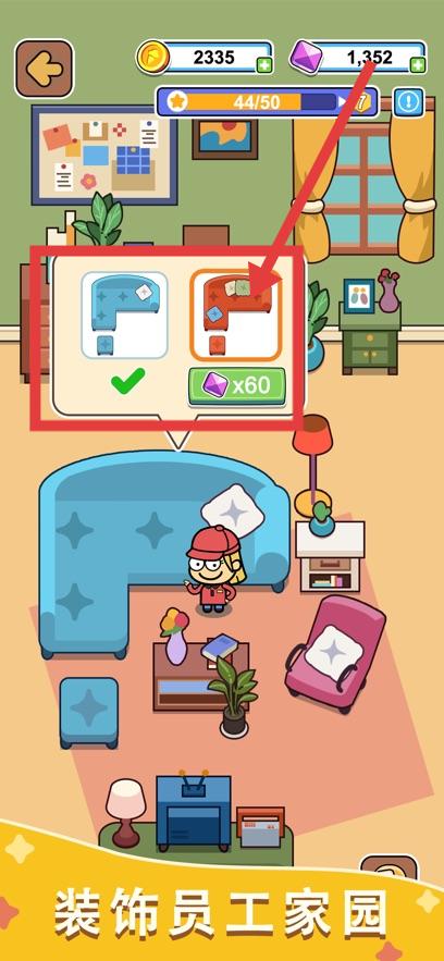 2、进入员工家园装饰界面,根据资源情况,选择并购买家具来装饰家园,提升家园等级(如44/50),解锁更多内容。