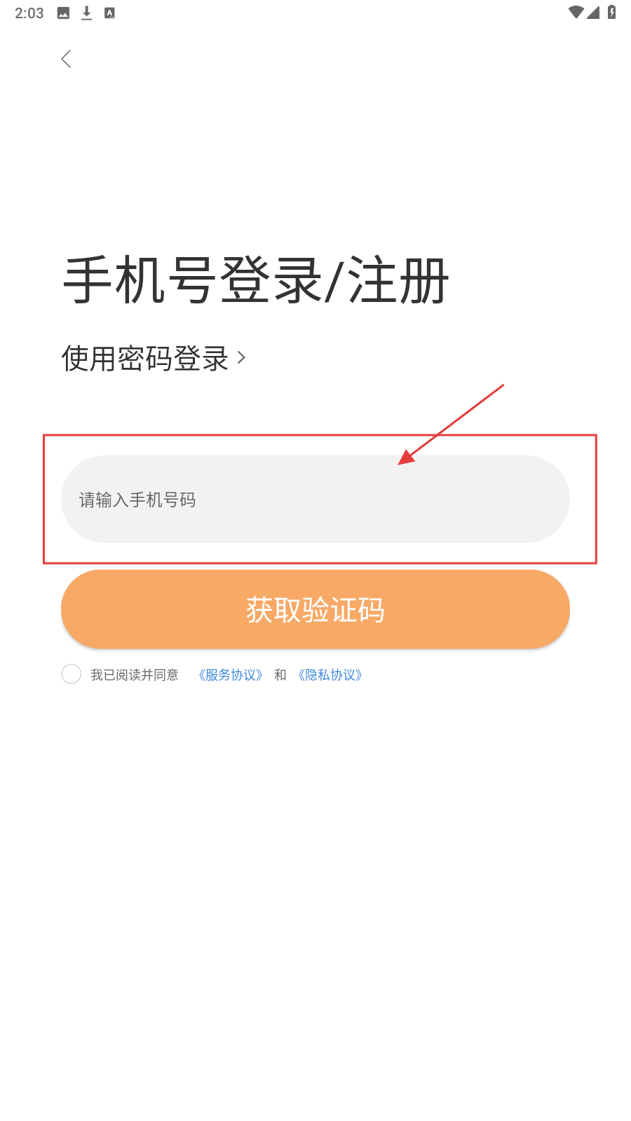 1、打开应用,进入【手机号登录/注册】页,在输入框填入手机号码。