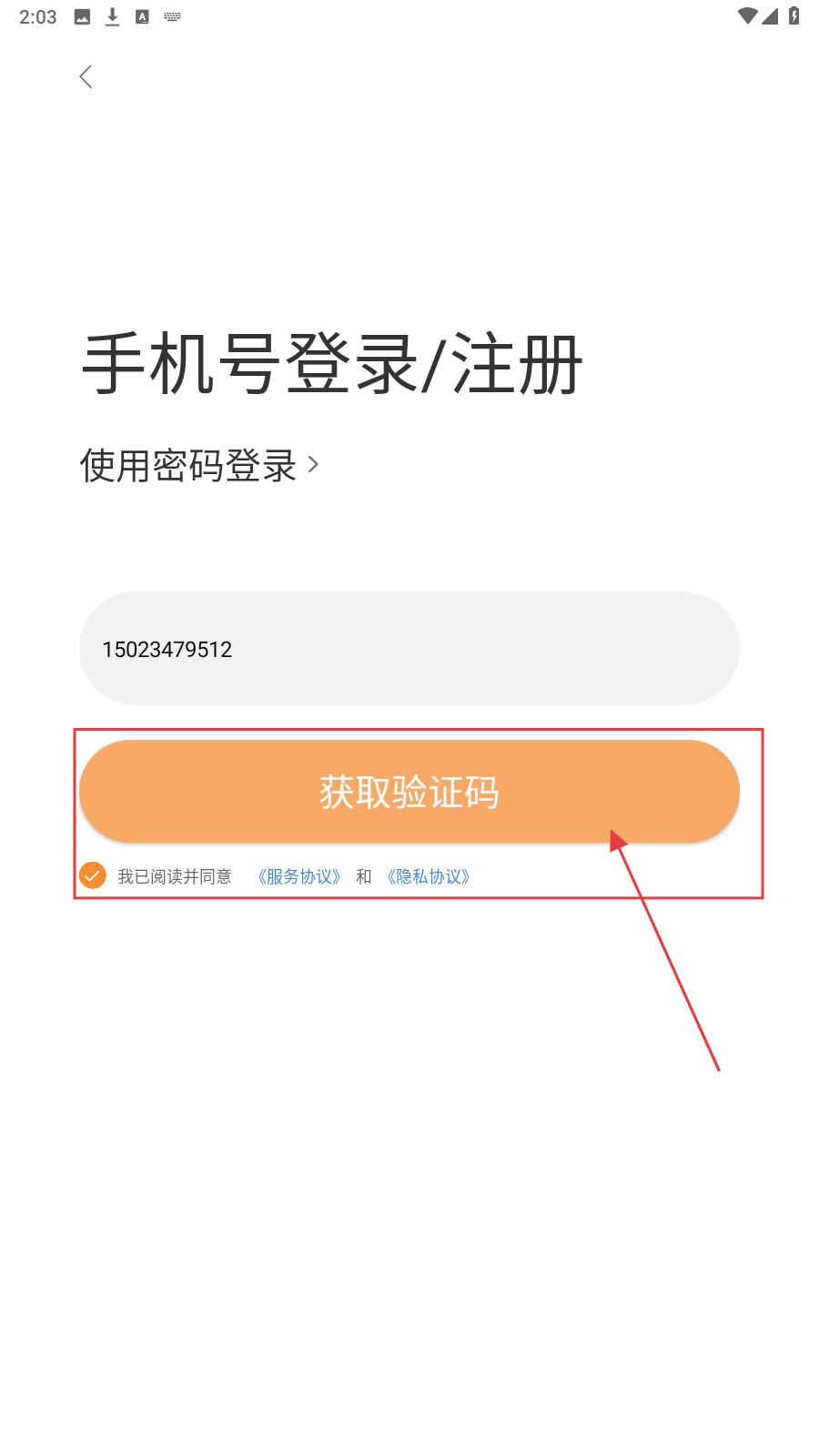 2、勾选【我已阅读并同意《服务协议》和《隐私协议》】,点击【获取验证码】。