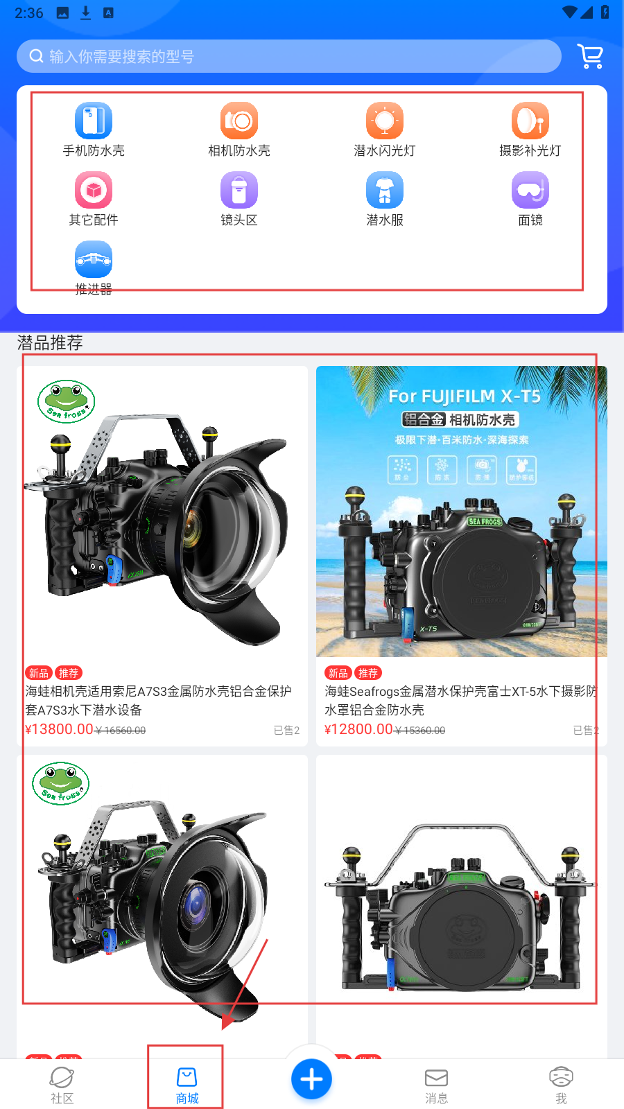 2、切换至商城页,按需挑选潜水装备(手机防水壳、相机防水壳等分类),查看潜品推荐商品。