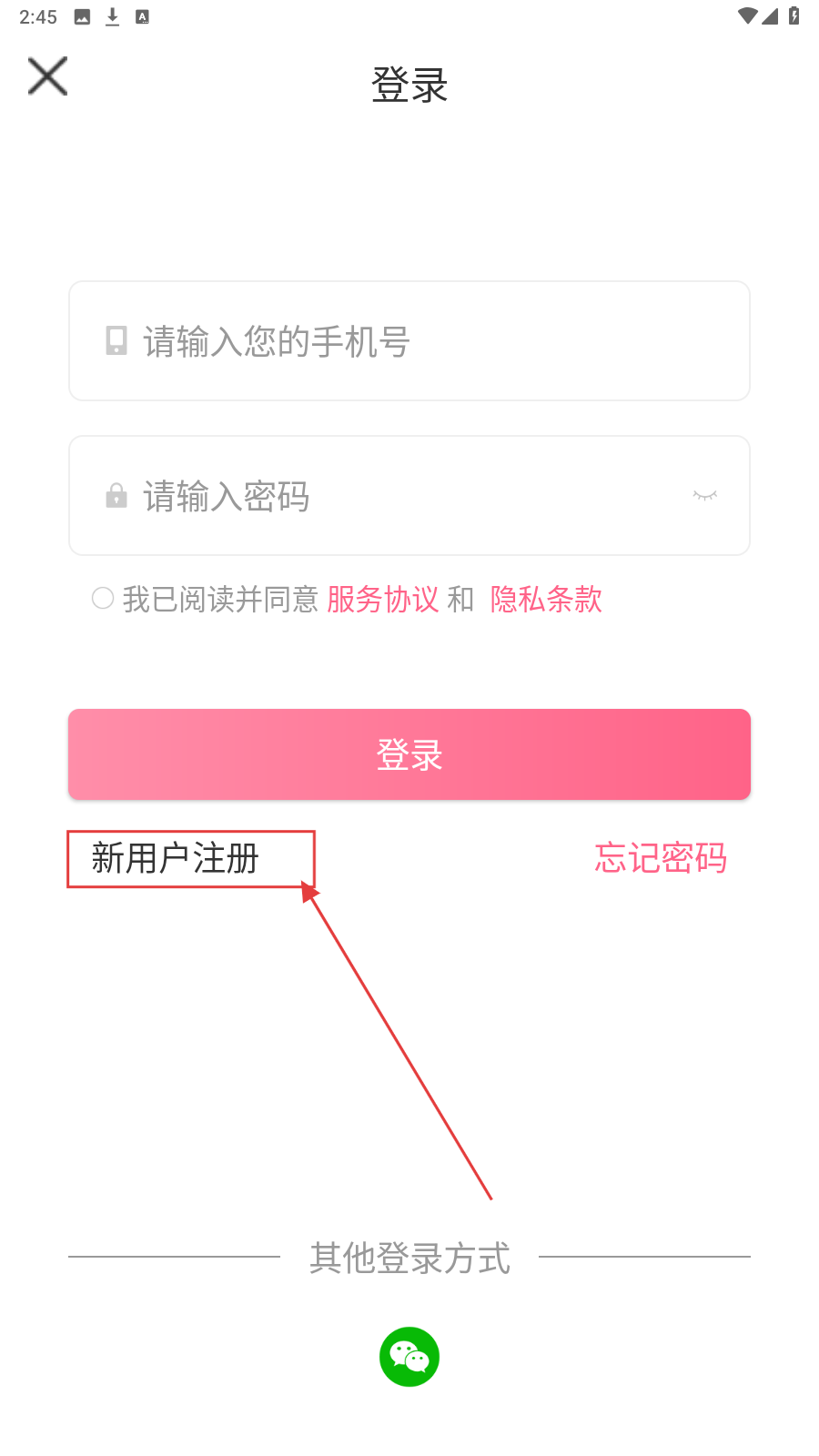 1、打开应用登录页,点击【新用户注册】,进入注册界面。