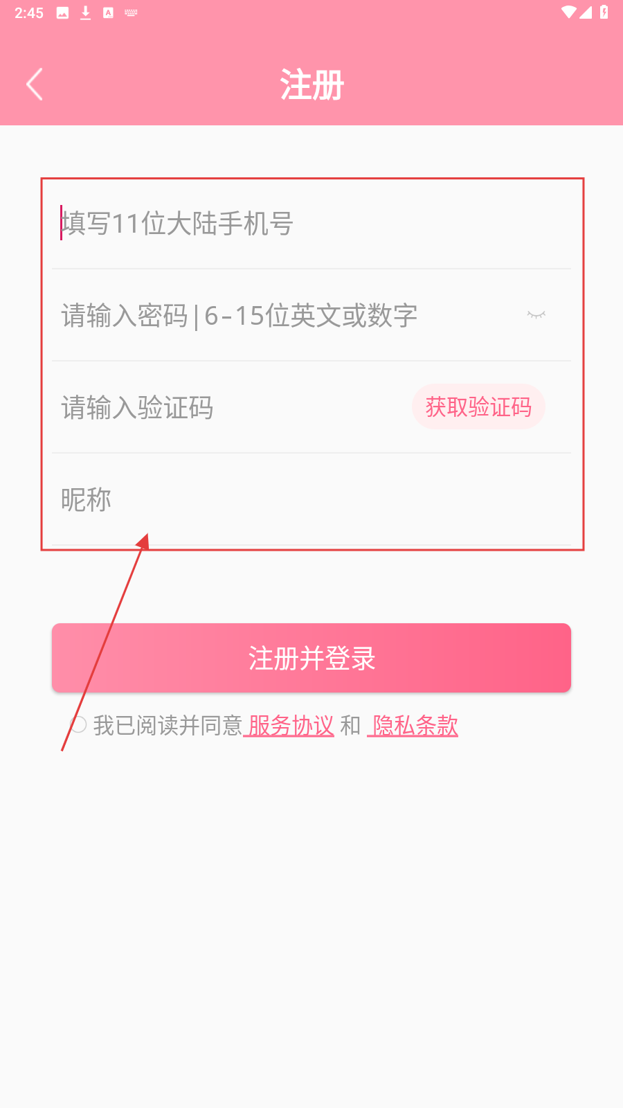 2、在注册页填写11位大陆手机号、密码、验证码、昵称。