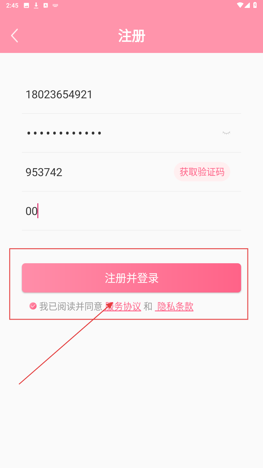 3、勾选【我已阅读并同意服务协议和隐私条款】,点击【注册并登录】完成注册流程。