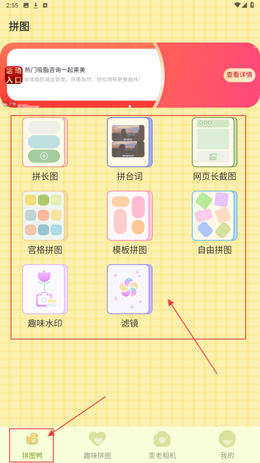 1、打开应用,进入【拼图鸭】页,选择拼图功能(如拼长图、宫格拼图等)。