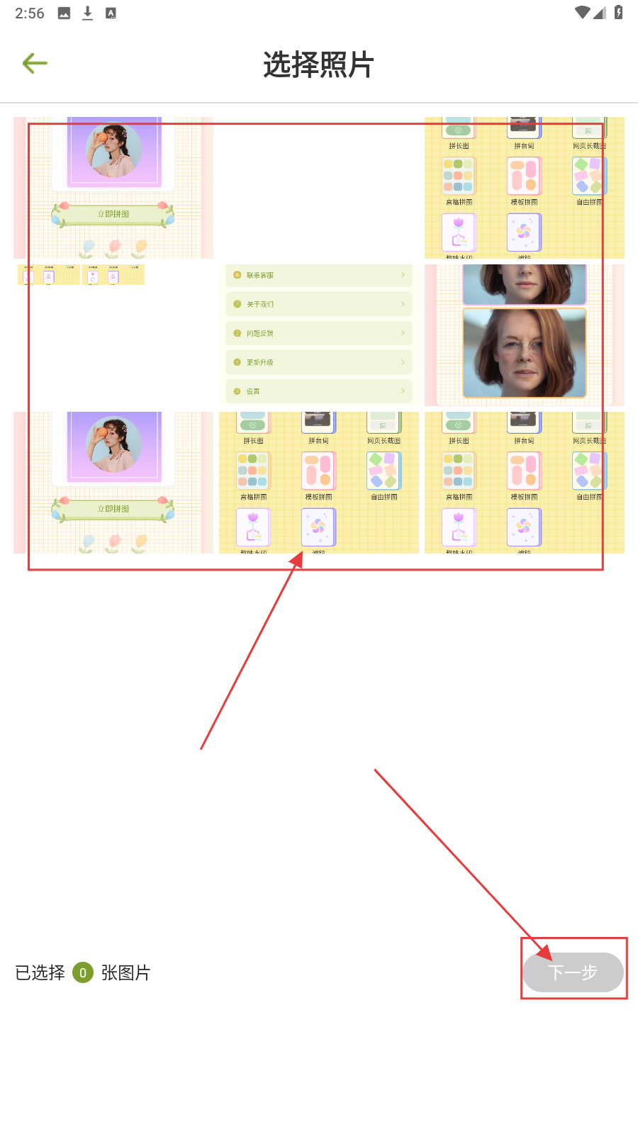 3、在【选择照片】页,勾选需拼图的照片,点击【下一步】,进行拼图操作。