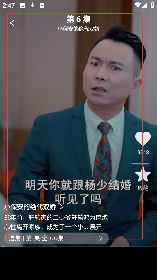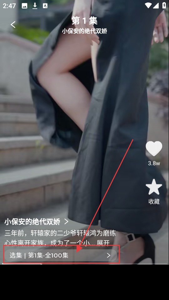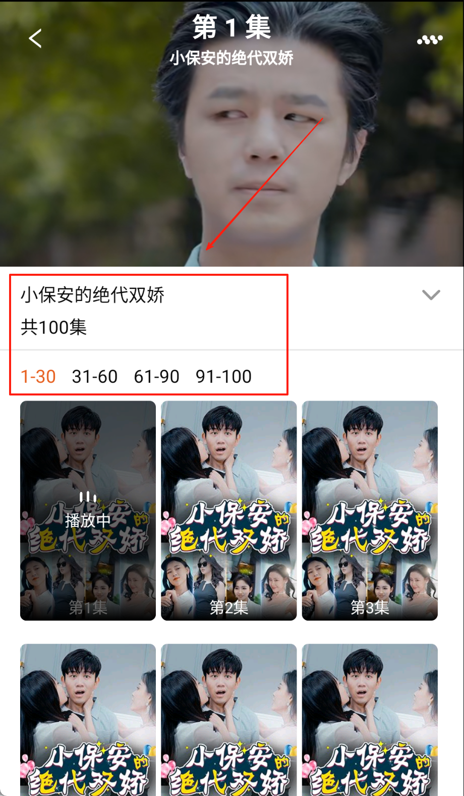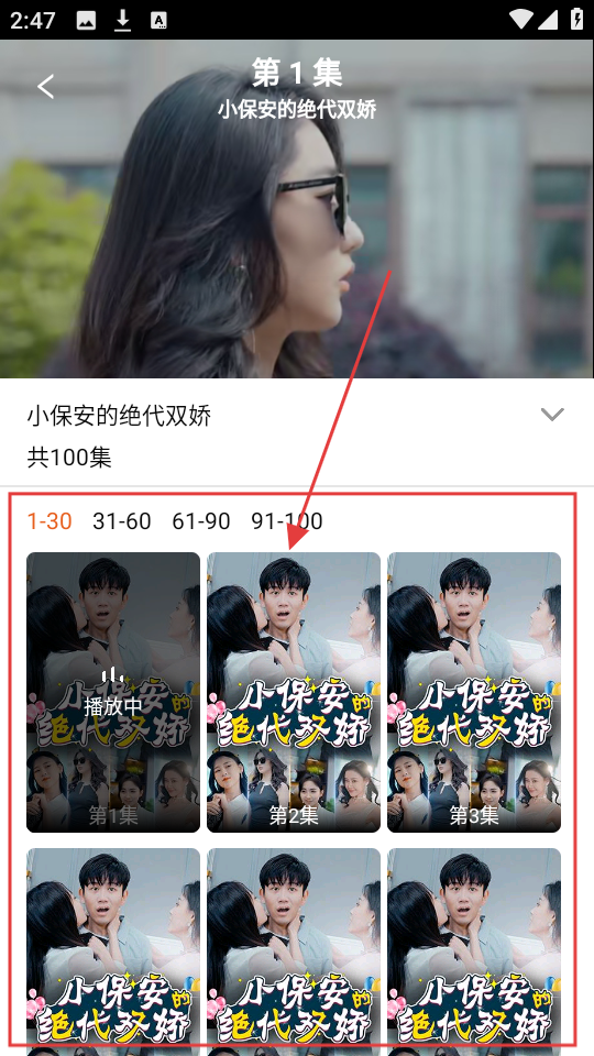 2、在短剧播放页面,点击【选集|第1集-全100集】选项,进入选集列表页面哦。