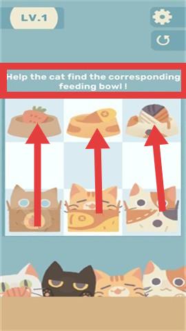 1、游戏开始,明确关卡任务,即帮助猫咪找到对应的食盆。在LV.1关卡,仔细观察猫咪和食盆的特征,将它们正确匹配。