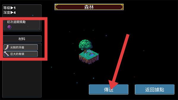 3、当进入森林等区域界面,看到有“初次過關獎勵”和材料时,可选择“傳送”进入区域探索,获取奖励和材料,提升角色能力。