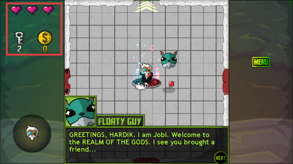 2、进入新场景后,留意左上角的状态标识,如爱心代表生命值(三颗心),钥匙数量(2把)和金币数量(0),合理规划资源使用。