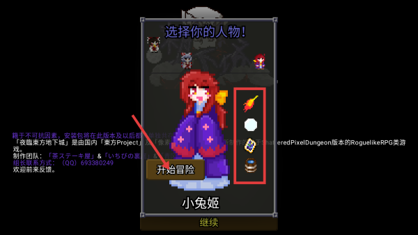 1、游戏开始,在角色选择界面,选中“小兔姬”后,点击“开始冒险”进入游戏。留意角色右侧的技能图标,了解其技能特点。
