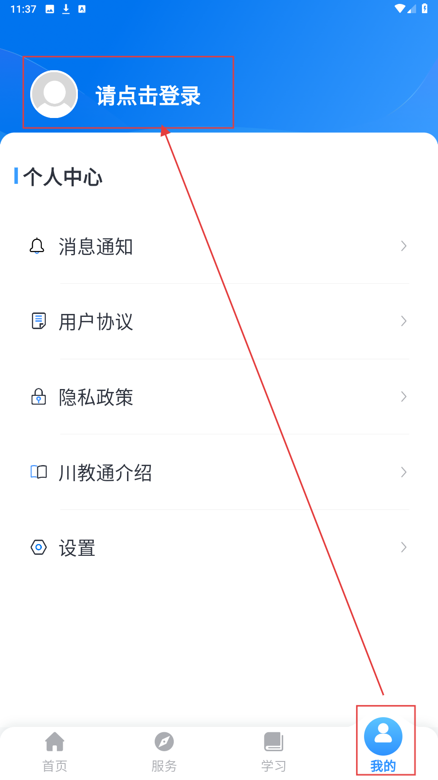 1、进入“川教通”应用【我的】页,点击【请点击登录】区域。