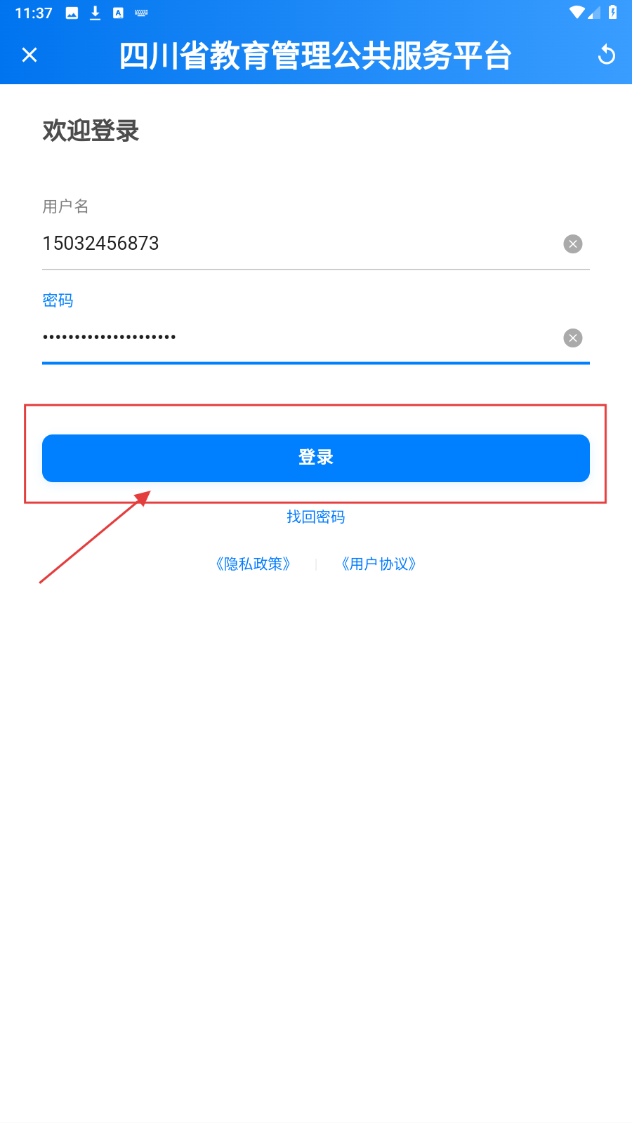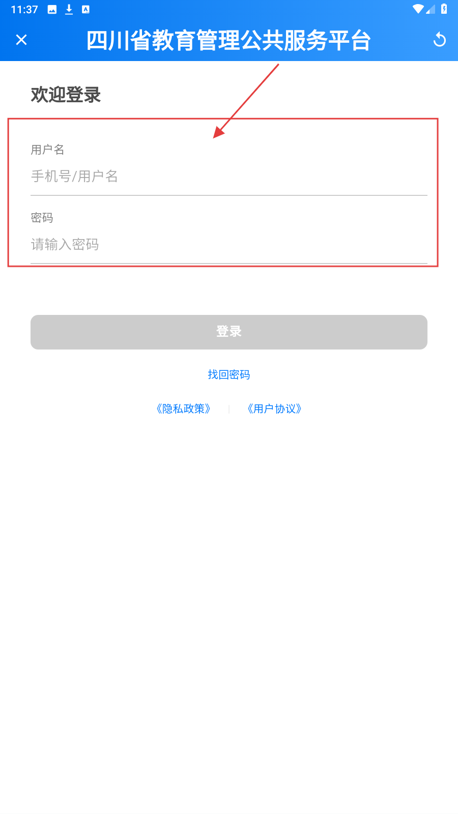 2、跳转至四川省教育管理公共服务平台登录页,在【用户名】栏填入账号,在【密码】栏填入密码。