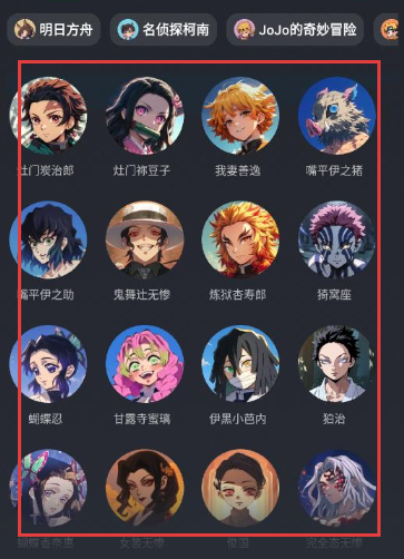 1、进入角色选择页,选《鬼灭之刃》角色(如灶门炭治郎等)或切换至《JoJo的奇妙冒险》IP角色。