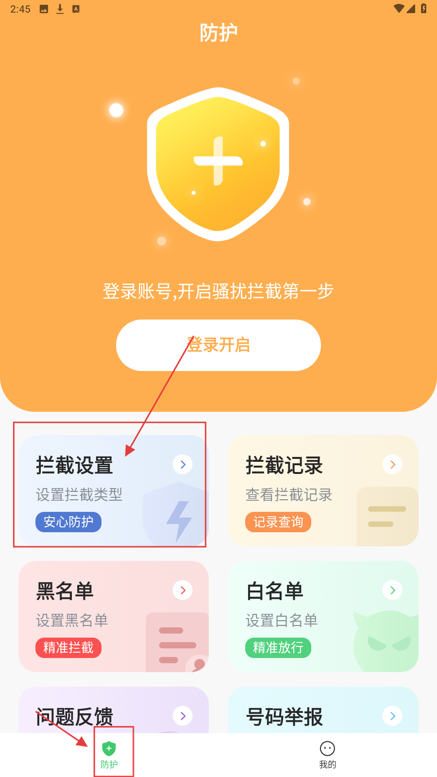 1、进入防护应用【防护】页,点击【拦截设置】,开启【骚扰防护】开关。