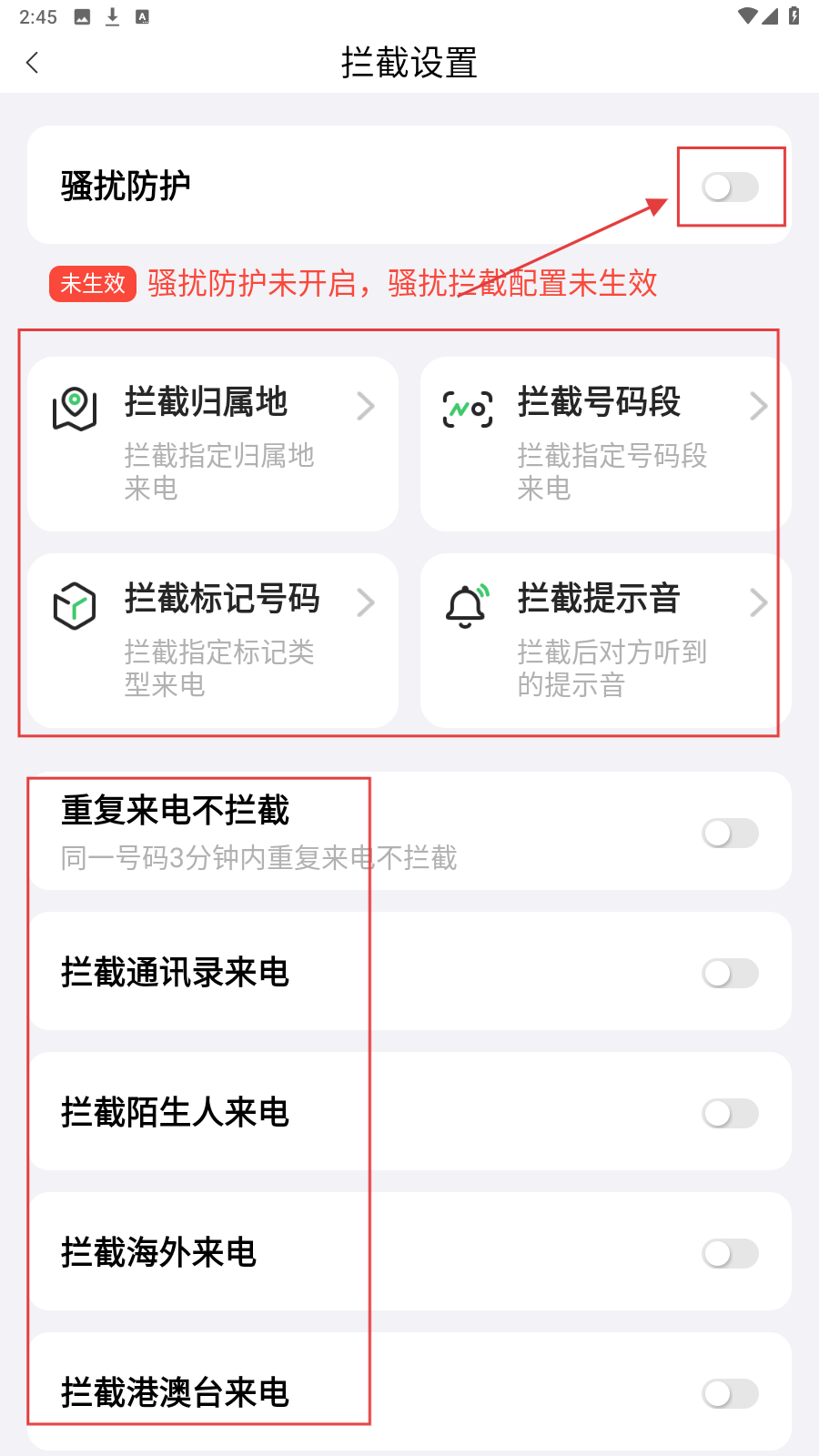 2、按需设置拦截规则(归属地/号码段/标记号码/提示音等),及重复、通讯录、陌生人等来电拦截选项。