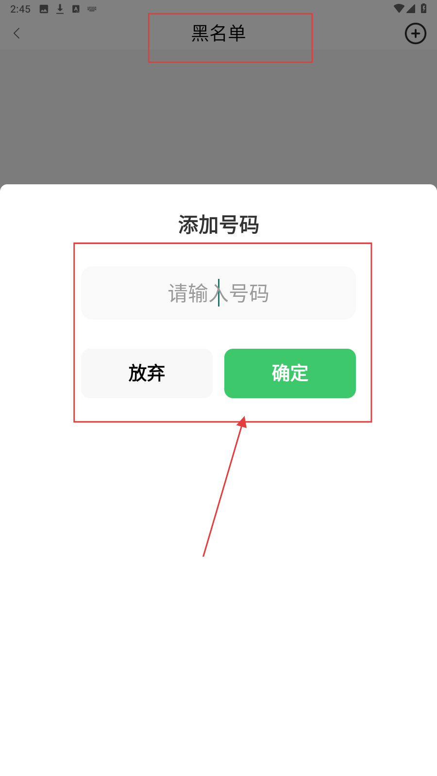 3、切换至【黑名单】页,点击添加,输入号码后点【确定】,完成黑名单设置流程。