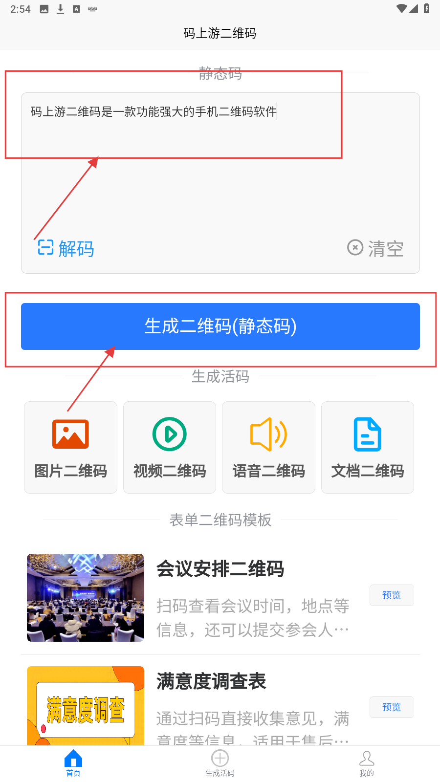 1、打开“码上游二维码”应用首页,在静态码文本框输入内容。