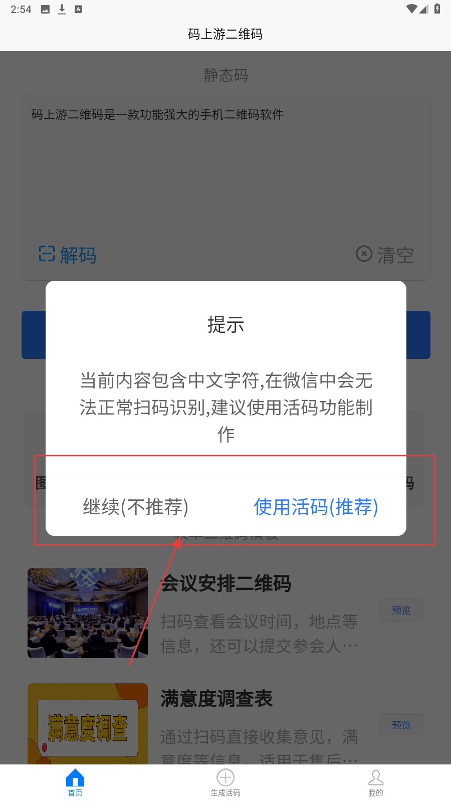 2、点击【生成二维码(静态码)】,在提示框选【继续(不推荐)】或【使用活码(推荐)】。