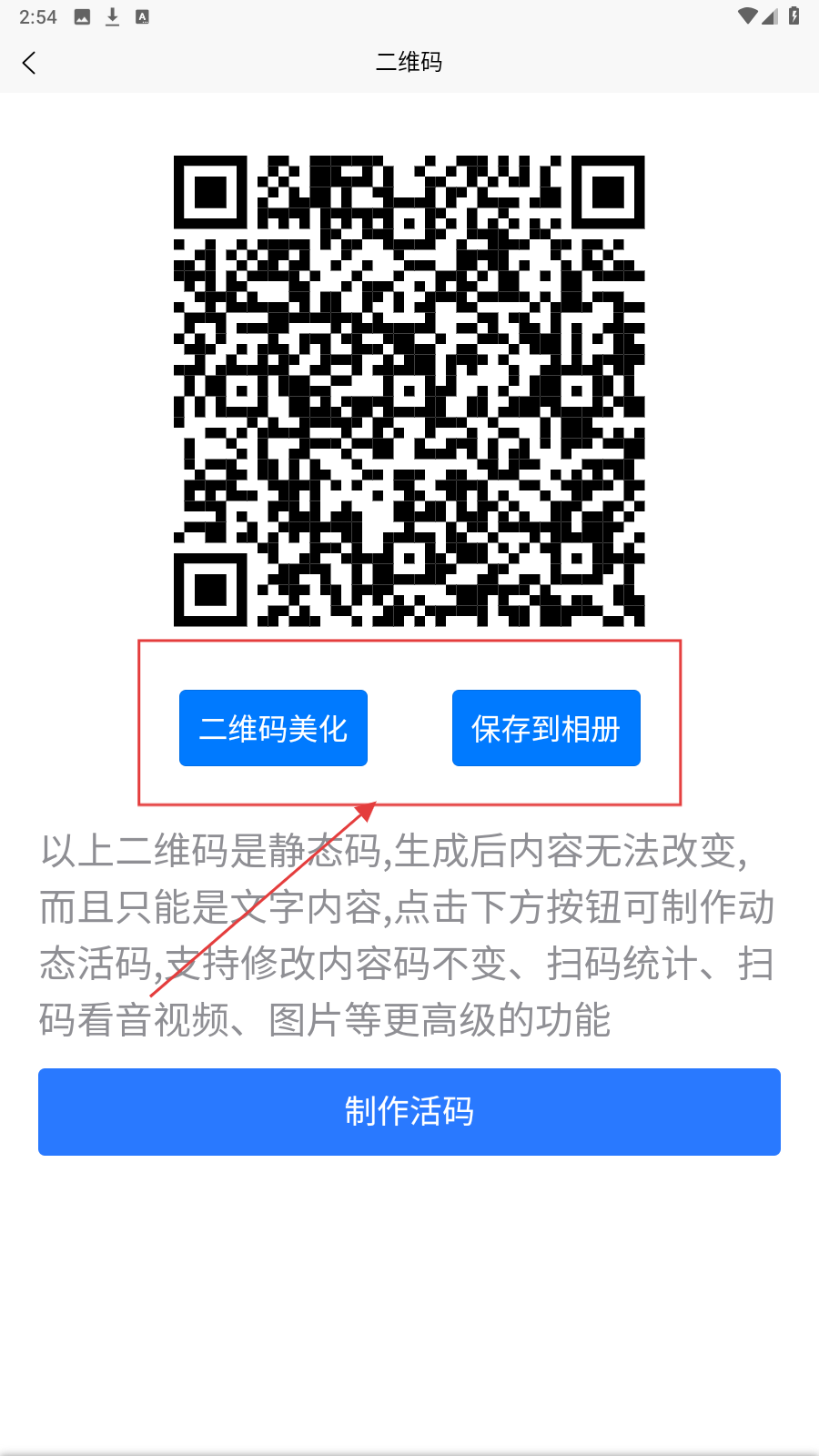 3、进入二维码页,按需点击【二维码美化】或【保存到相册】,完成静态码生成流程。