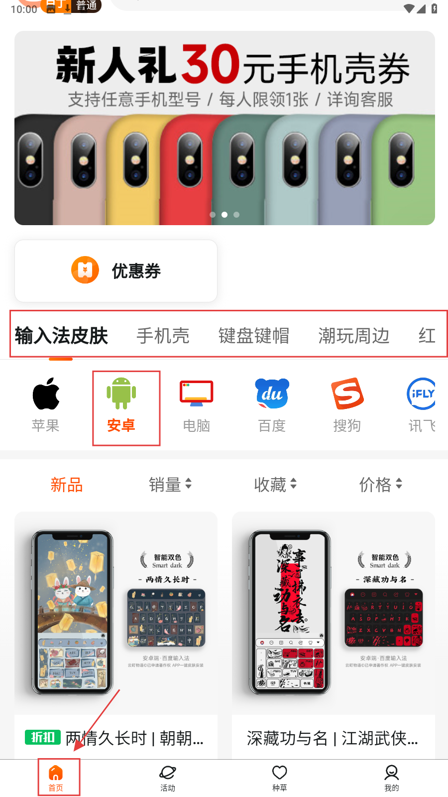 1、打开应用,在【首页】选分类(输入法皮肤/手机壳等)。