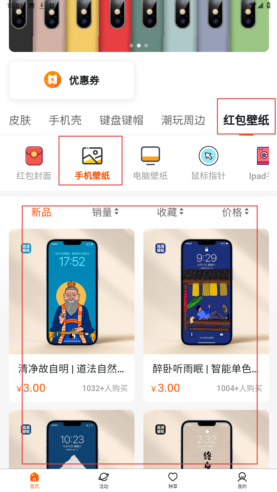 2、切换至【红包壁纸】分类,选【手机壁纸】,浏览新品壁纸(如“清净故自明|道法自然”),点击进入详情页。
