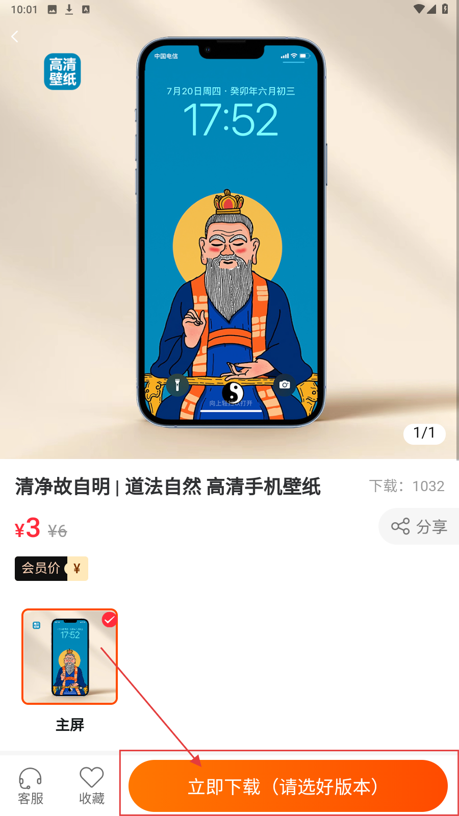 3、确认壁纸(选主屏等版本),点击【立即下载(请选好版本)】,完成壁纸选购下载。