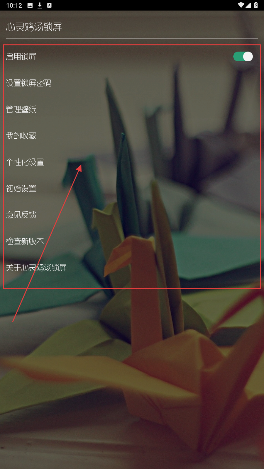 1、打开“心灵鸡汤锁屏”应用,在主设置页,选择功能项(启用锁屏/设置锁屏密码等)。