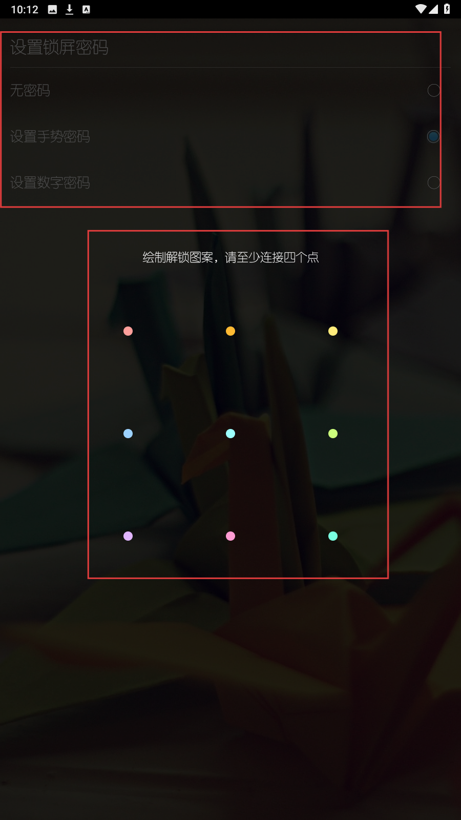 2、若选【设置锁屏密码】,进入密码设置页,选密码类型(手势/数字),按提示操作(如绘制至少4点的手势)。