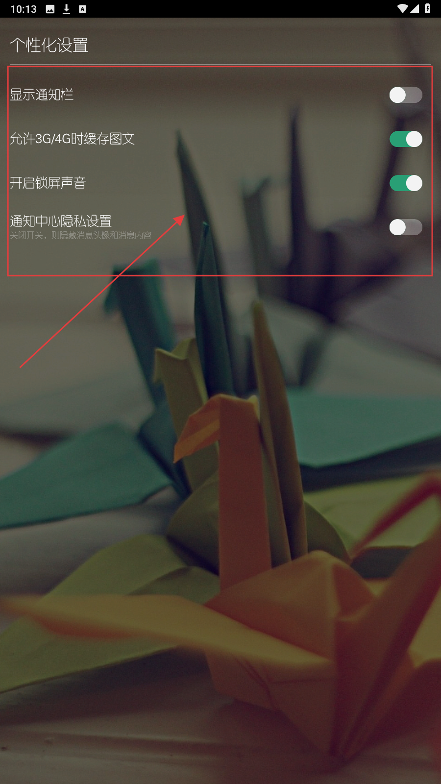 3、若选【个性化设置】,进入对应页,调整开关(显示通知栏/缓存图文等),完成设置流程。