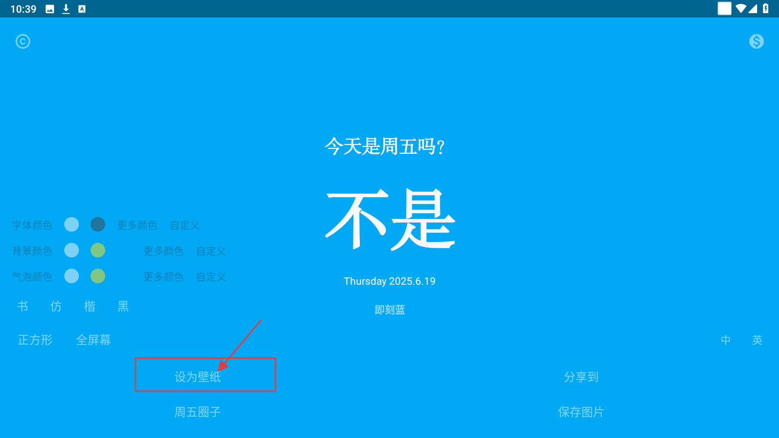 2、确认文字(“今天是周五吗?不是”及英文等)、样式设置后,点击【设为壁纸】等功能(或分享/保存)。