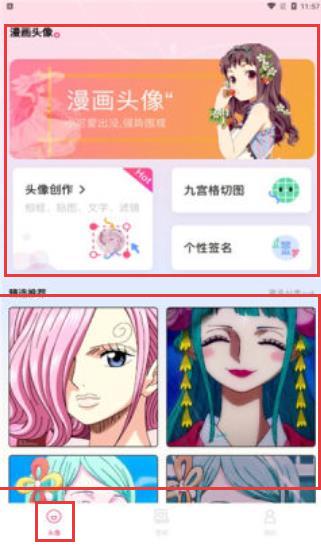 1、打开应用,在【首页】选服务(漫画头像制作/九宫格切图等),进行创作(添加素材、调整样式)。