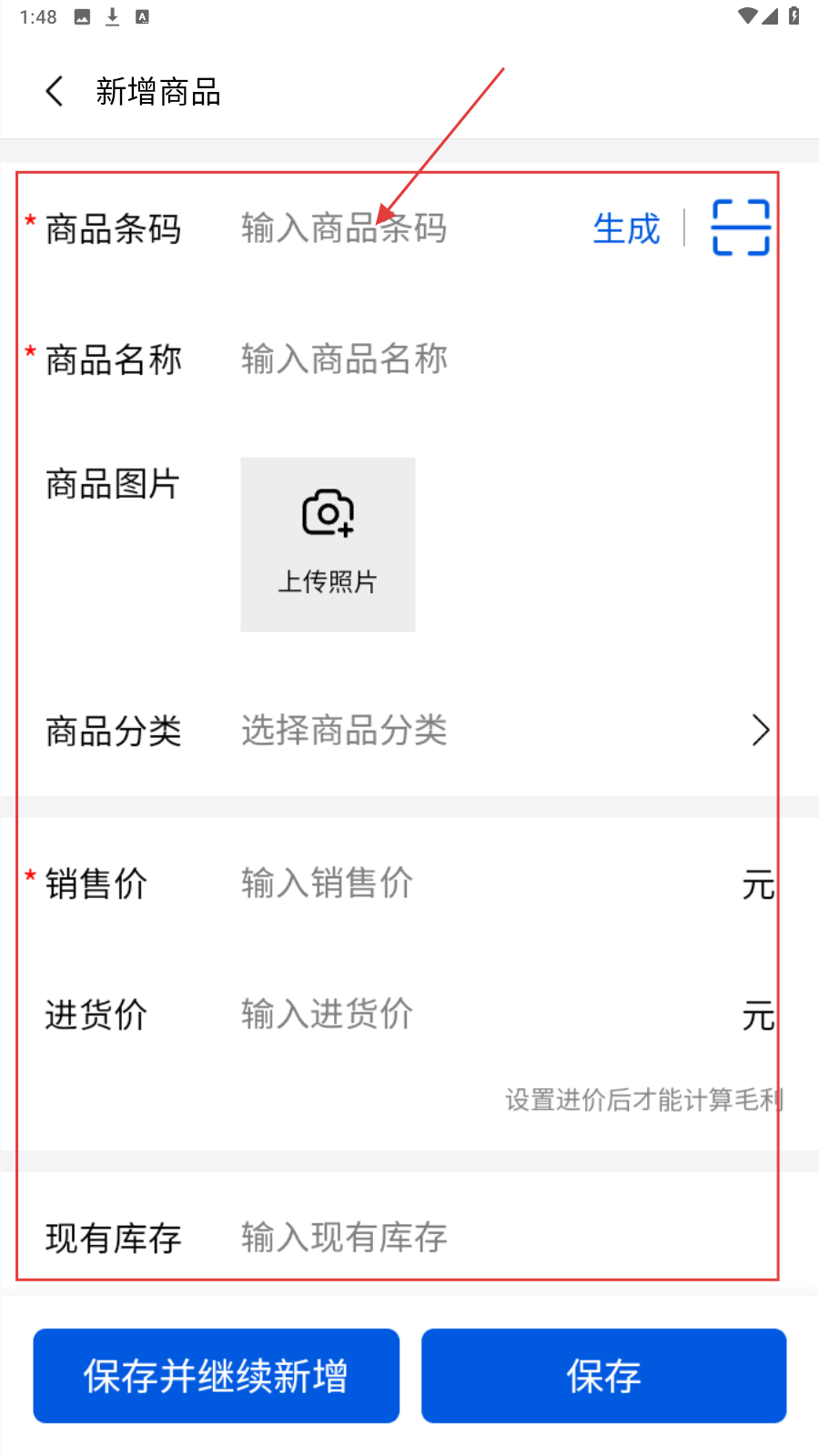 2、进入【新增商品】页,填商品条码、名称、售价等必填信息,按需传图片、选分类。